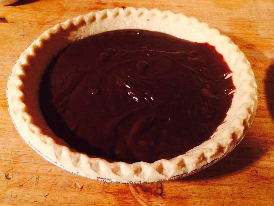 Half done, the pre-baked pie shell, filled with the chocolate creme.
