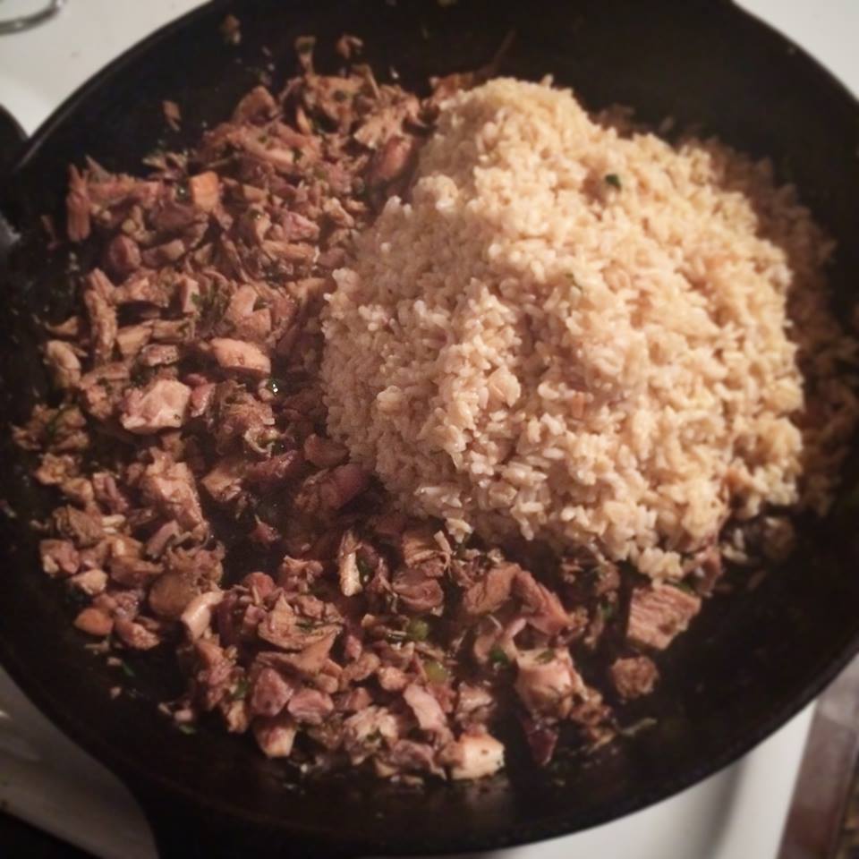 Chop up the left over turkey and throw in a skillet on medium heat, with a teaspoon or so of olive oil. Start it cooking, and then add the sesame oil, rice vinegar, soy sauce, cilantro & green onions, while you also put the rice on to boil in a separate pot. When the rice is done, combine the rice with the turkey mix.