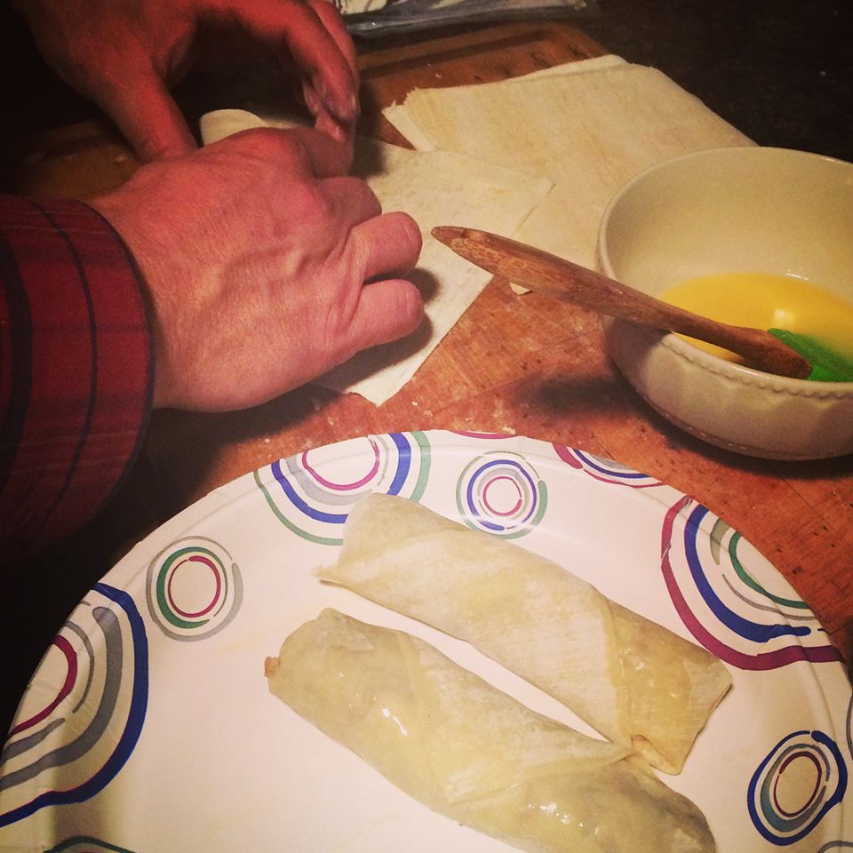 I occasionally get shown up in the kitchen by my husband (aka Indiana Jones). And I’m sorta OK with that, at least when he’s helping and not hindering. Once you’ve rolled your burrito (I mean egg-roll) up, brush the top flap with a little bit of the egg/water mixture to seal it.
